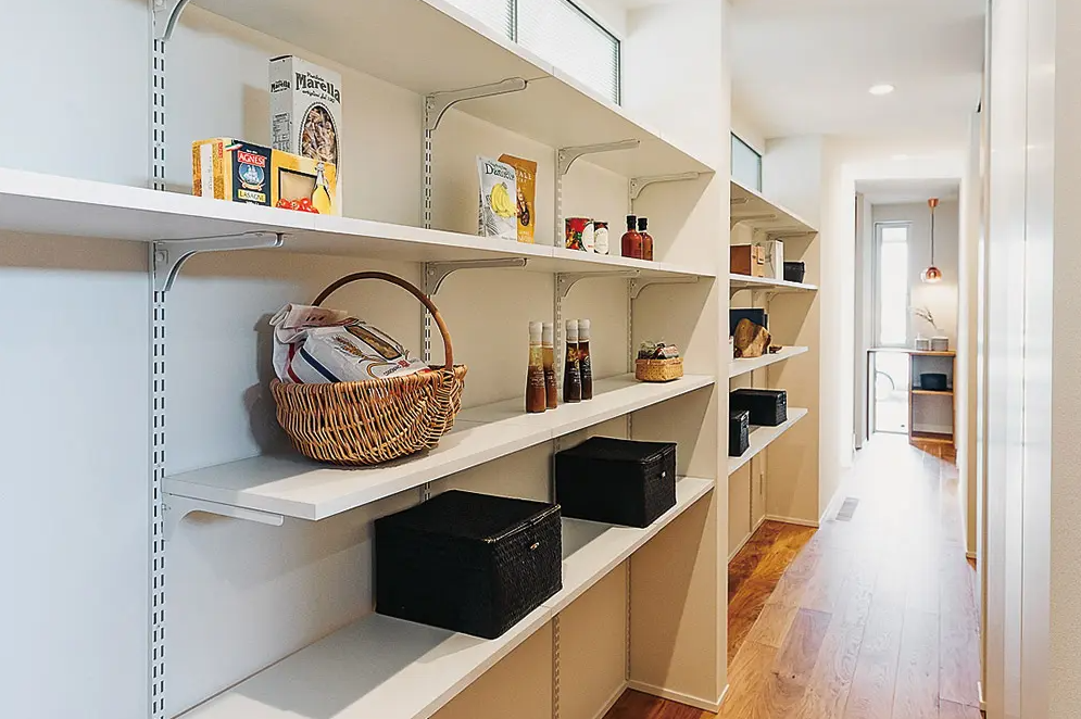 キッチンの背面、各個室へつながる廊下にあたる部分は、各所に収納を設けバックヤードとしての機能を持たせた。壁面の収納棚には、日用品やストック品、コレクションなどを格納。「正面に坪庭が見える窓があるので、視線が抜けて窮屈感はないですね」と奥さま