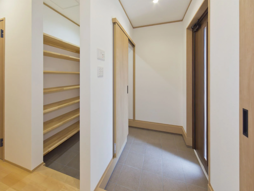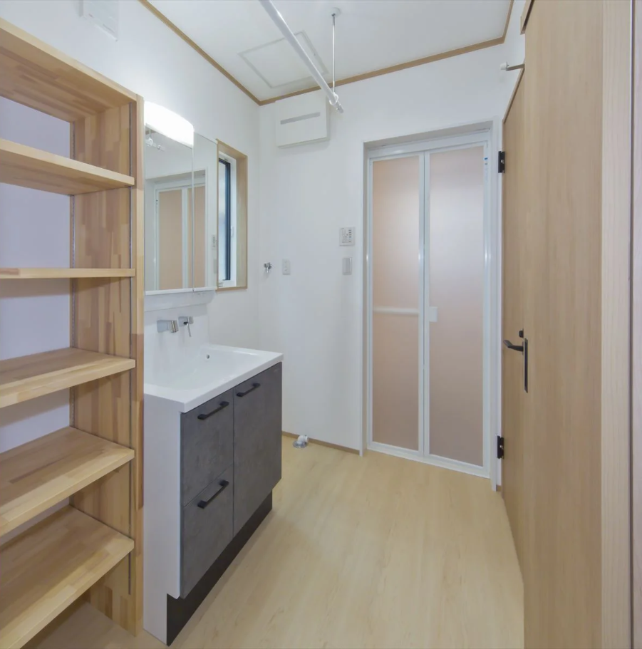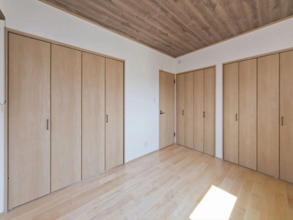 建物全体の床材にサクラの無垢フローリングを使用しているので、室内が明るく仕上がっています。リビングルームは、キッチンの木目調下がり天井とアクセントクロスが、シンプルでありながら個性的な印象を感じさせる一方、木目調の壁紙を天井に採用した和室は個室として、やすらげる雰囲気を感じさせてくれています。