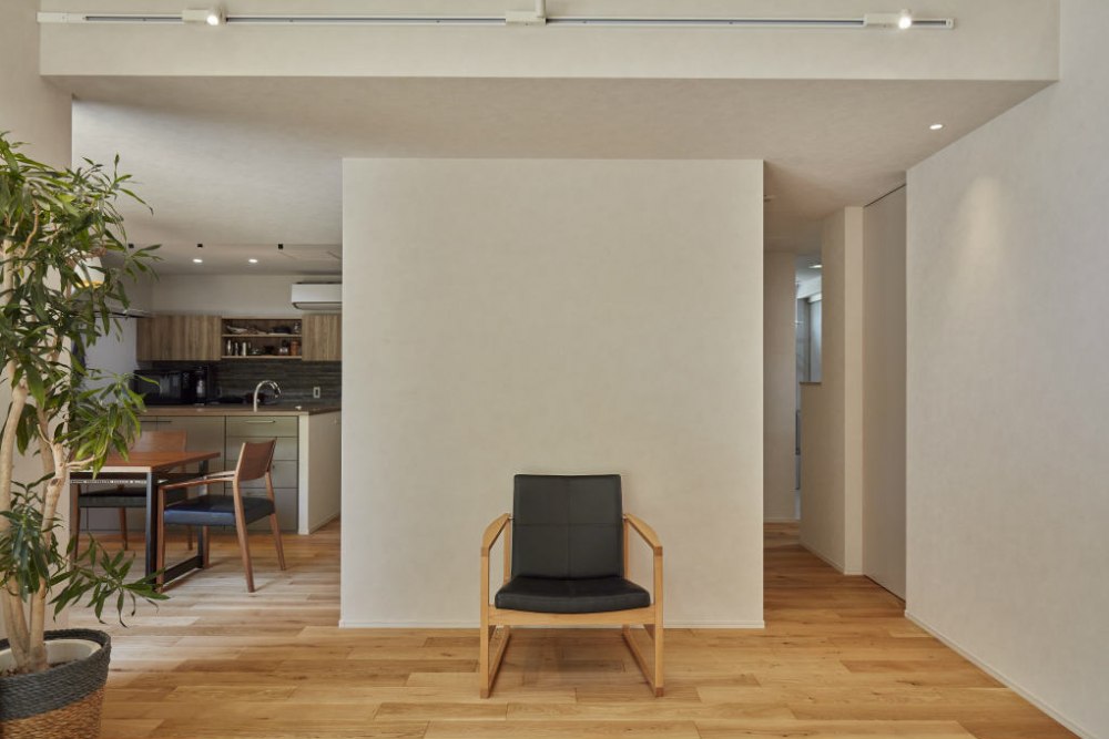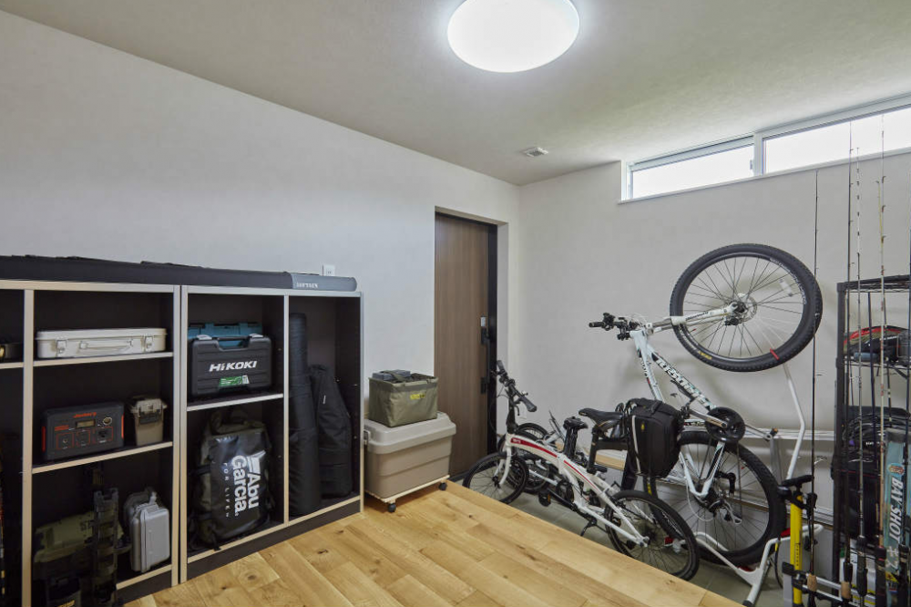 高台に位置し、周りに緑が多い環境の立地。地形を最大限活かして道路側にはほとんど窓を設けず、大きな開口部は内側に向けた「お籠り設計」に。コンパクトさと開放感という相反するコンセプトを大切にした「まるで別荘」のようなお家。これから向かえるシニア気を考慮し、寝室から水廻りへの動線を短く計画するなど生活動線に重きを置いたプランニングに。