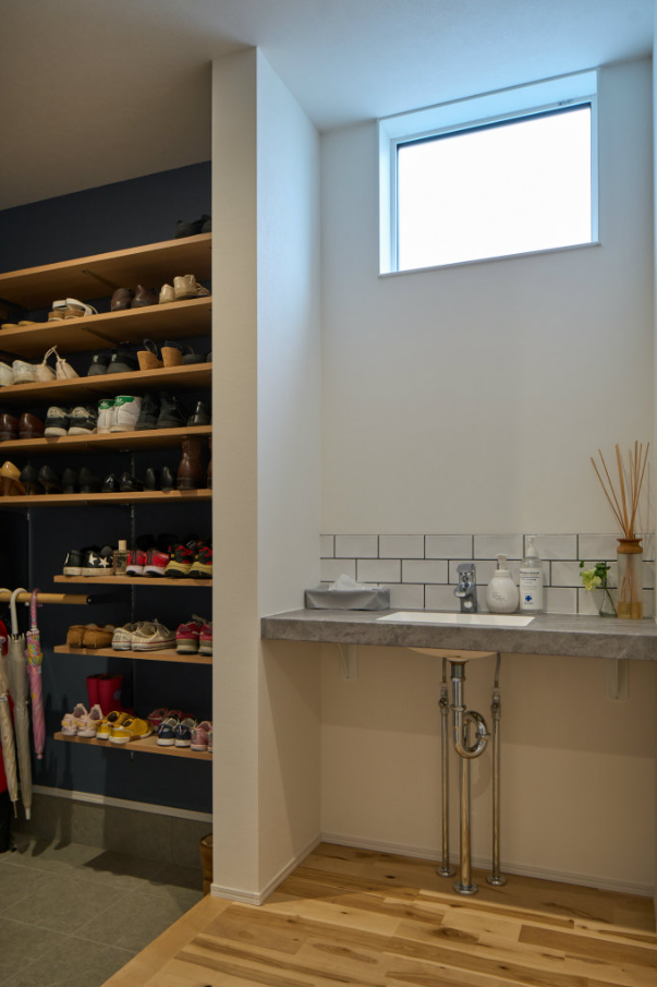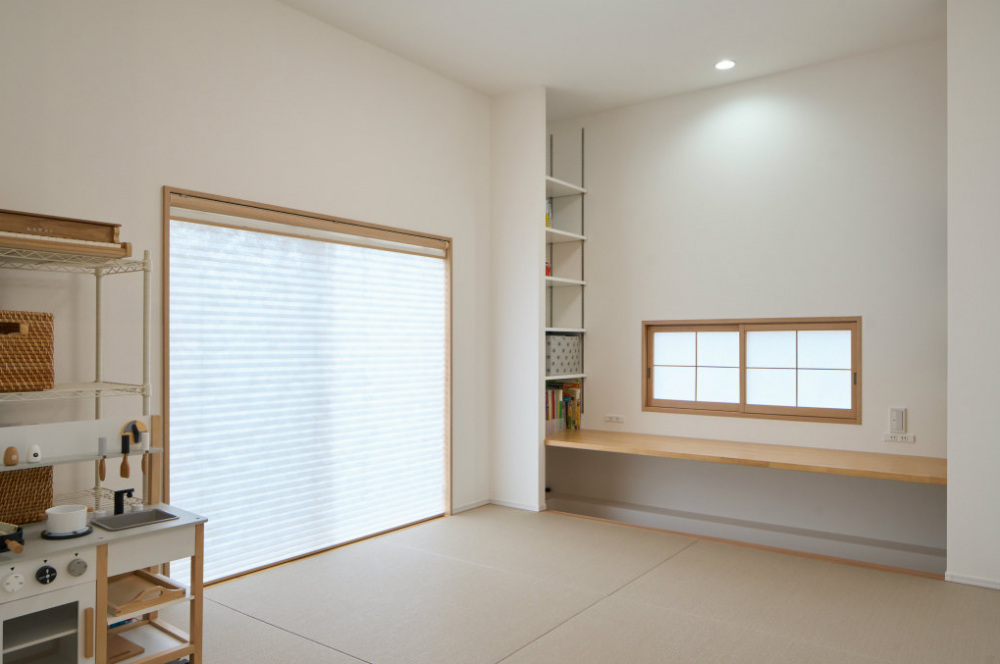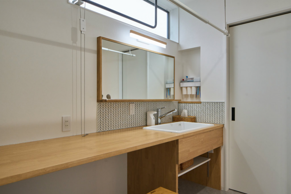 スキップフロアには、たっぷりの本が並ぶ造作本棚を設置。明るく心地の良いヌックペースで、読書に没頭したりお昼寝を楽しんだり、リラックスタイムを満喫できます。水廻りの直線配置で生活&家事ラク動線を確保。