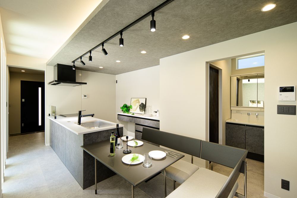 リビングから直接愛車の様子を眺めることができるビルトインガレージです。室内は、キッチンからダイニング、リビングへと一直線に繋がる開放的なレイアウトを採用。ガレージからの荷物の搬入もスムーズな動線設計や、ヤシの木が映えるリゾートライクな外構デザインなど、平屋の利便性とラグジュアリーな日常を両立させました。