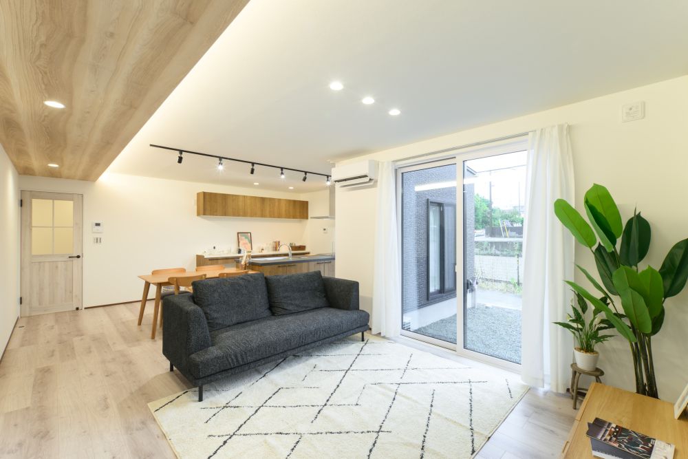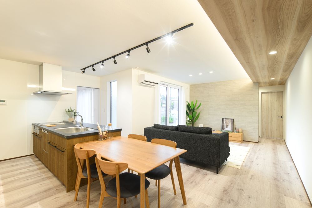 ライトブラウンの床と天井が、家族の集う場所を優しく彩ります。