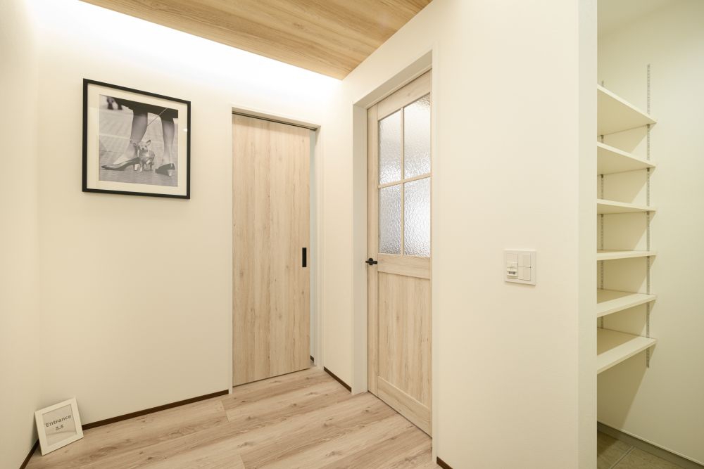 扉や棚までライトブラウンで統一された、温もりある玄関先。