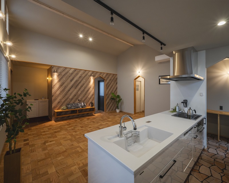 広々としたカバードポーチは雨の日も安心、晴れの日には腰かけて風を感じられるアメリカンハウスならではの心地よい空間です。勾配天井のLDKは温かな光に包まれ、家族が自然と集まる開放的な場所に。使い勝手の良いキッチンと便利な作業スペースが、日々の暮らしをスマートに支えます。