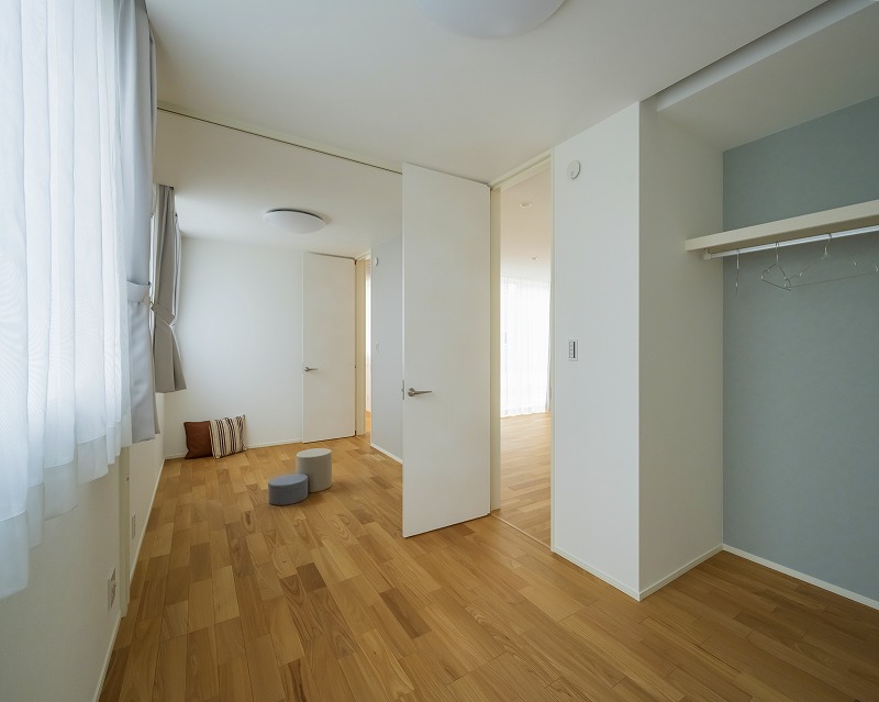 明るい光が差し込む子供部屋は、のびのび遊んだり勉強したりと多目的に使えます。クローゼットも備えているので衣類やおもちゃの収納も安心。将来は間仕切って2部屋に分けることもでき、成長に合わせて柔軟に対応できます。