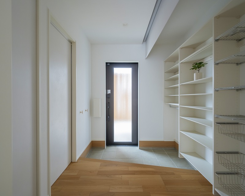 玄関に設けた可動棚は、靴やコート、掃除用具までたっぷり収納できる大容量スペース。使う人に合わせて高さを調整できるので無駄なく使え玄関がいつもすっきり片付きます。さらに来客時にはロールスクリーンで隠せるのも魅力。