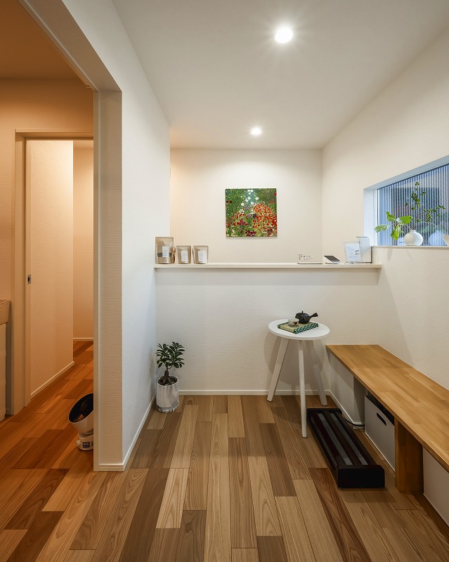 お客様をやさしく迎え入れる受付。待ち時間やお会計の際に腰掛けられるベンチを設け、落ち着いて過ごせる空間に仕上げました。