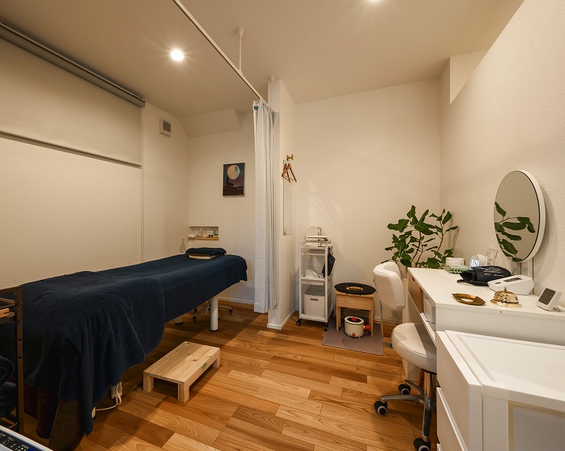 落ち着いた雰囲気と清潔感を大切にした上質な空間。壁面には鍼を置けるニッチを設け、施術中もスムーズに対応できるようにしました。