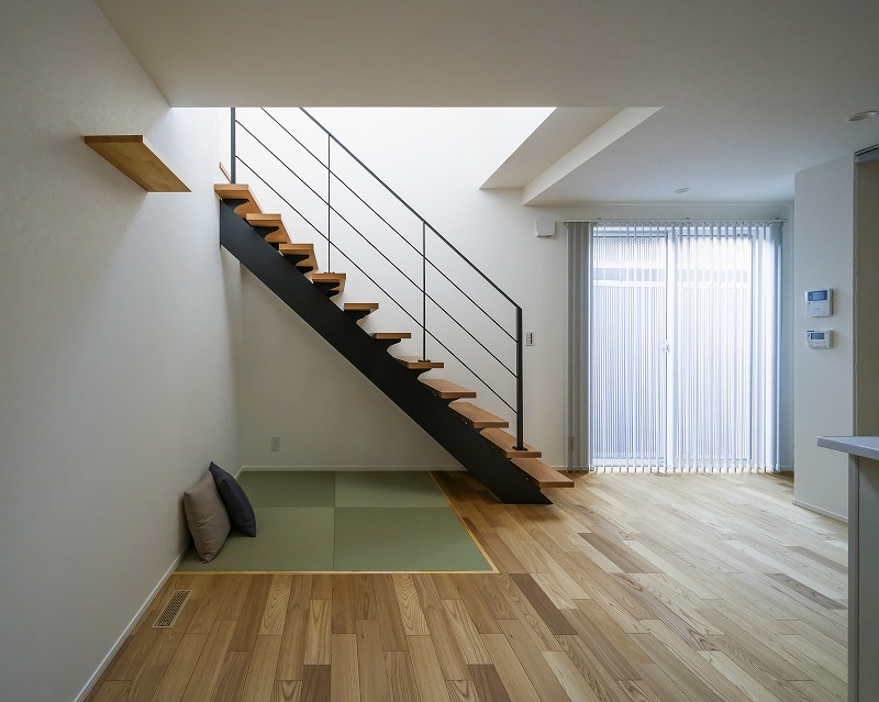 空間のアクセントになるリビング階段。踏板には木の質感、手すりにアイアンを組み合わせることで軽やかな印象に仕上げました。視線が抜けることで圧迫感を抑え、上下階をゆるやかに繋ぐ心地よい空間です。