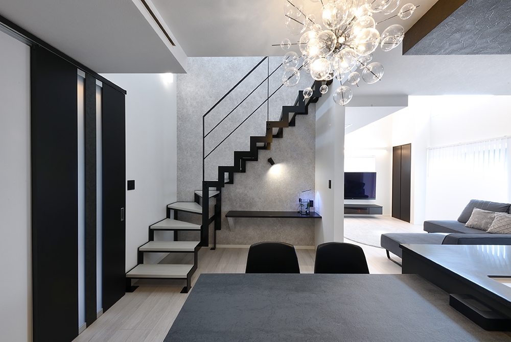 黒を基調とした、統一感のあるラグジュアリーなデザインの住まい。全館空調の快適性に加え、バブルシャンデリアやスケルトン階段が映える高い意匠性が魅力です。洗濯から収納まで完結する効率的な家事動線や、多目に使える小屋裏など、暮らしを愉しむ工夫も満載。洗練されたデザインと機能美が融合したお住まいです。【Smart One Custom】