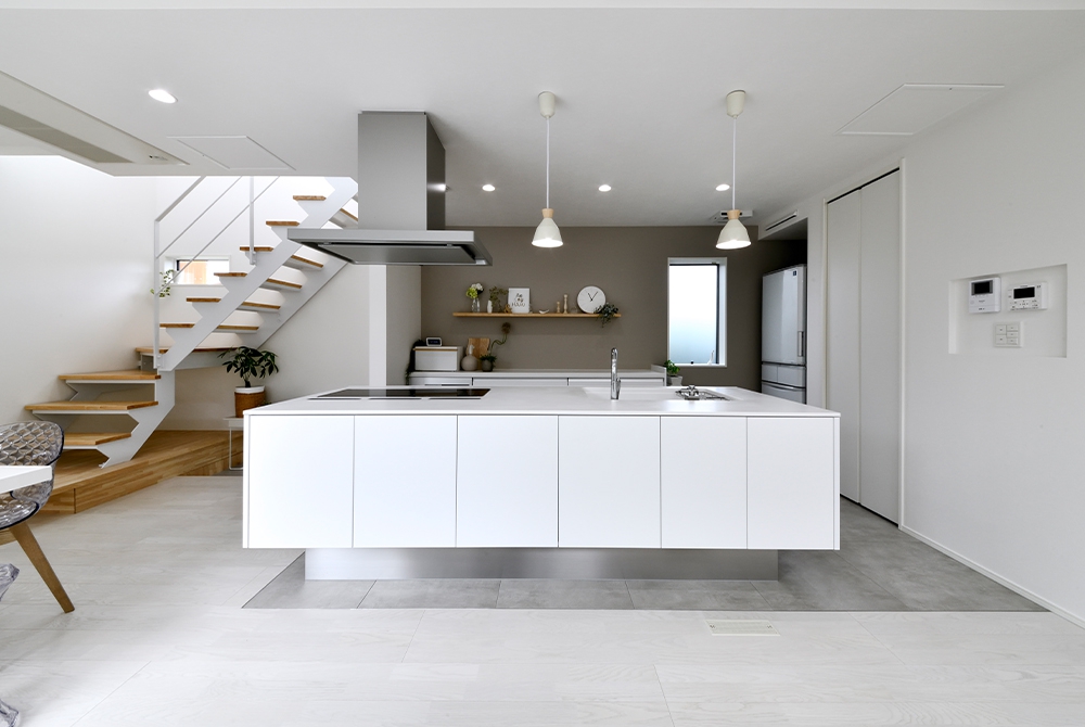 黒で統一された重厚感ある外観に対し、室内は白を基調としたホテルライクな大空間が広がります。吹き抜けやスケルトン階段、中庭へ視線が抜ける大きな窓など、開放感を高める仕掛けが満載。ダウンフロアのリビングやアイランドキッチンが洗練された印象を与え、日常を贅沢に彩る上質な住まいを形にしています。【Smart One Custom】