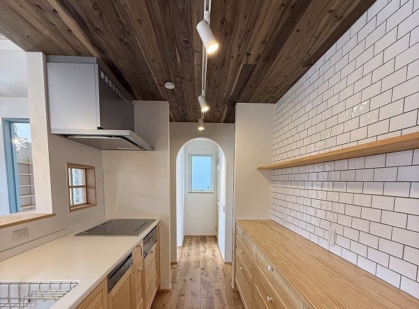 板張りの天井と真っ白なサブウェイタイル