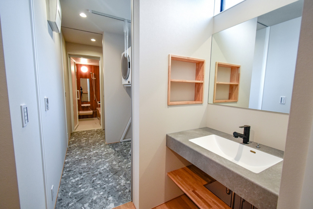 造作の洗面台は、モルタル調の天板と木目の組み合わせがモダンな印象。奥には天候を気にせず室内干しができる広々としたサンルーム、そして浴室へと一直線に繋がる、日々の負担を軽減する機能的な家事動線を確保しています。
