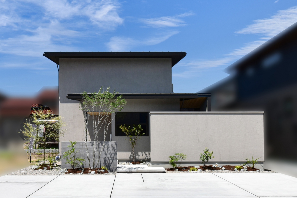 直線を基調とした端正なフォルムに、グレーの塗り壁が美しく映える外観デザイン。軒裏の木目や、アプローチに添えられた植栽の緑が、無機質になりがちな外観に温かみと豊かな彩りを添えています。