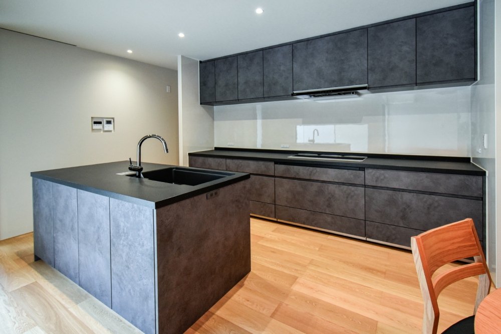 モルタル調のスモーキーな面材が美しい、フラットなアイランド型キッチン。背面収納も同素材で統一することで、生活感を感じさせない重厚でスタイリッシュな佇まいに。