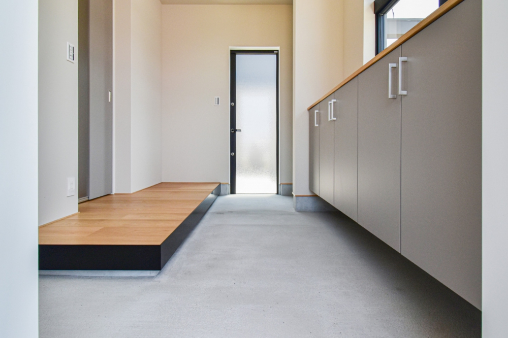 すっきりとしたモルタル土間が広がる、シンプルで無駄のない玄関スペース。フロート仕様の収納を採用することで足元に抜け感が生まれ、限られた空間をより広く、洗練された印象に見せる工夫が施されています。