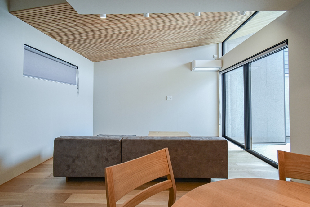 リビングには板張りの勾配天井を採用し、縦への広がりと木の温もりを感じられる空間に。大きな窓からは中庭の自然光がたっぷりと降り注ぎ、外の景色を楽しみながらゆったりとくつろげる開放的な設計です。