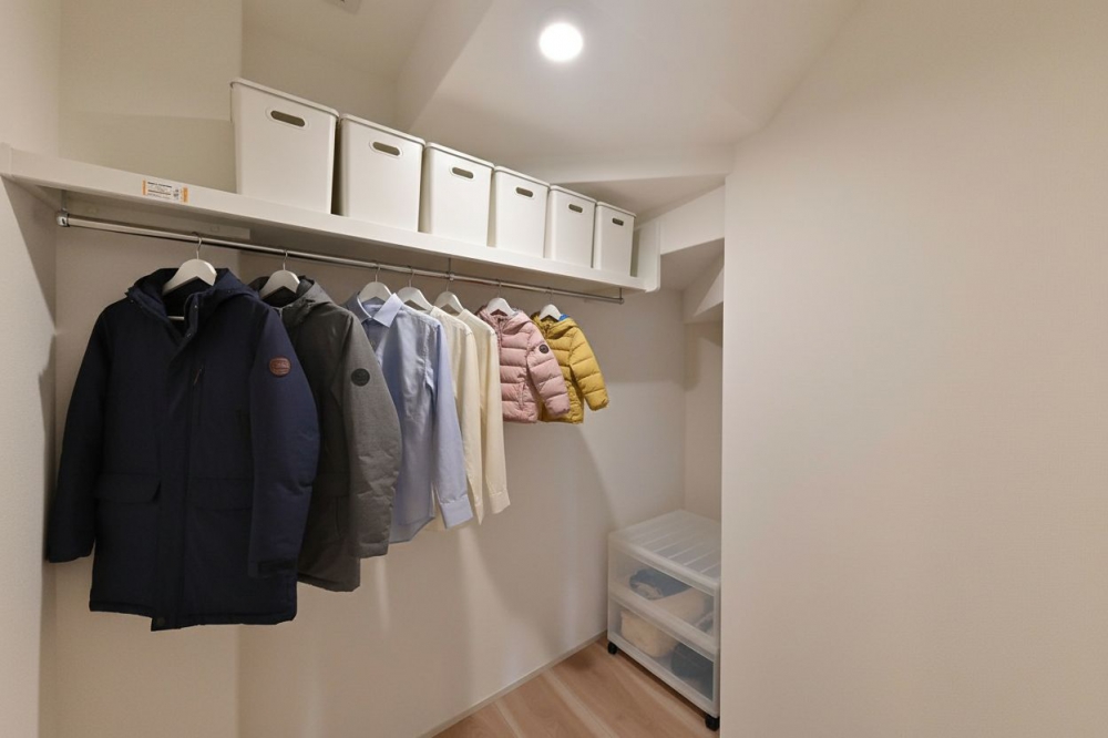 ランドリールームの隣にファミリークロゼットがあり、たたんだ衣類を片づけやすい収納動線となっています