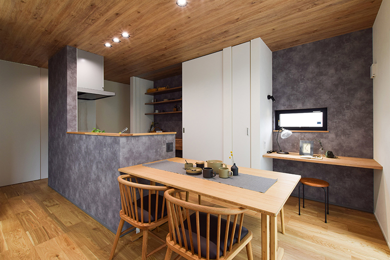 木目天井とグレーの壁が落ち着いた雰囲気を演出。ダイニング横には様々な用途で使えるカウンターを設けた。
