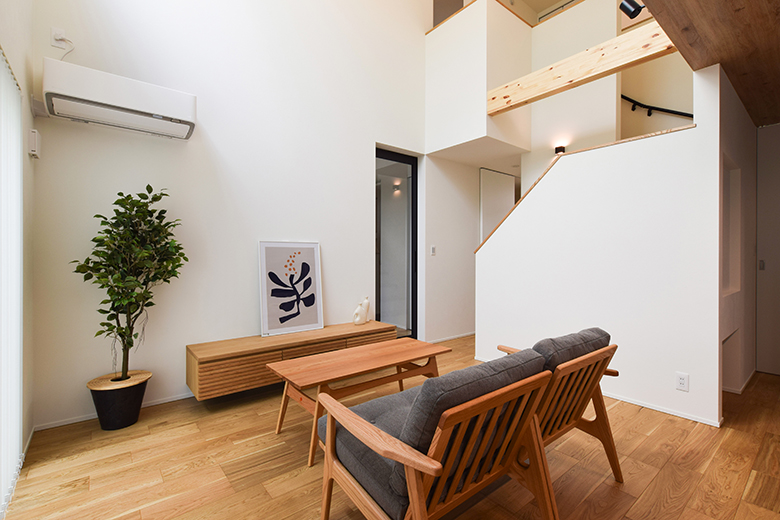 開放感あふれるリビングは吹抜けから自然光がたっぷり入り、居心地の良い空間に。