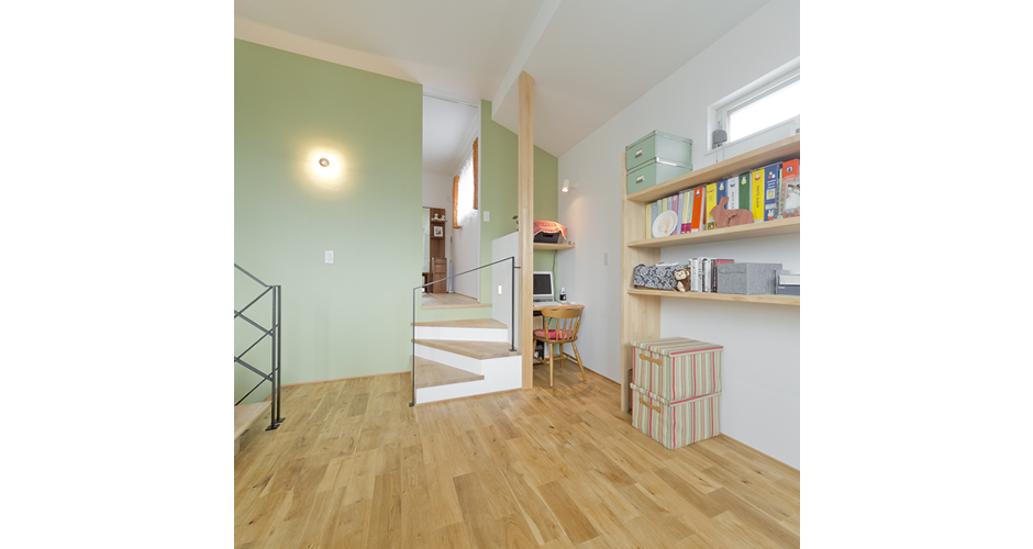 吹き抜けに面したファミリースペースは開放感抜群で、本棚やデスクを造作し勉強部屋として活用できます。