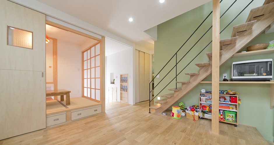引き戸で全面開放できる和室は下部収納を採用床は全部屋オークの無垢材。