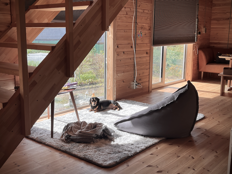 土間から畳敷きのリビングへはステップを上がって。リビングの縁に腰掛け愛犬と戯れることも。
