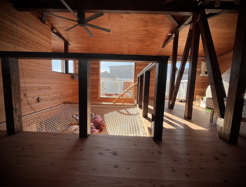 2階に1階が見渡せる窓を設けました。家族全員がお互いに顔を出して遊べるところになりました。