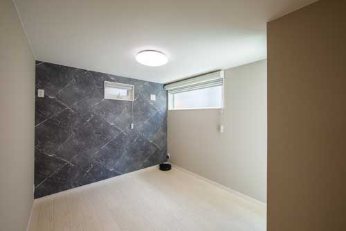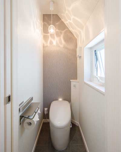1階のトイレには間接照明を取り入れたり、リビングはアクセントクロスが用いられおしゃれな仕上がりに。