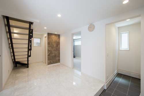 鏡面仕上げの美しい床が際立つ広々とした玄関ホール。オープン階段でスタイリッシュに