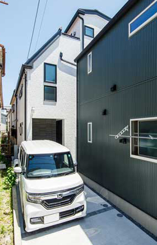 白を基調としてシンプルにまとめた外観。黒縁の窓がアクセントとなり、格好良く仕上がっている