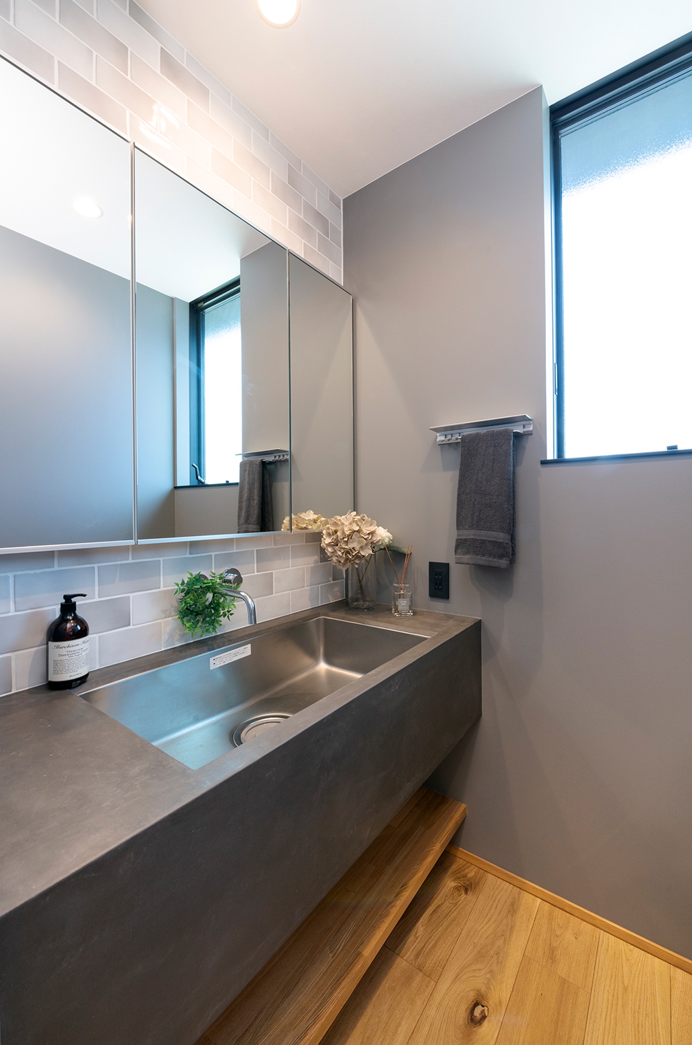 モールテックス天板と白タイルが調和した造作洗面化粧台 。無垢材の自然な質感が空間全体を引き締め、モダンで心地よい雰囲気を演出