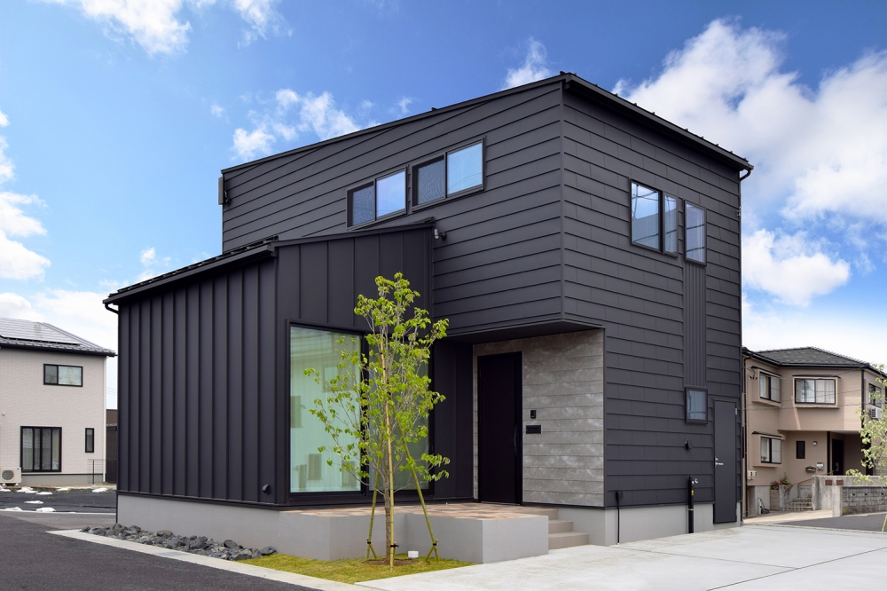 ブラックのガルバリウム鋼板とセメントの質感を活かした外装材「SOLIDO」を組み合わせた立体的な外観。シンボルツリーはハナミズキ