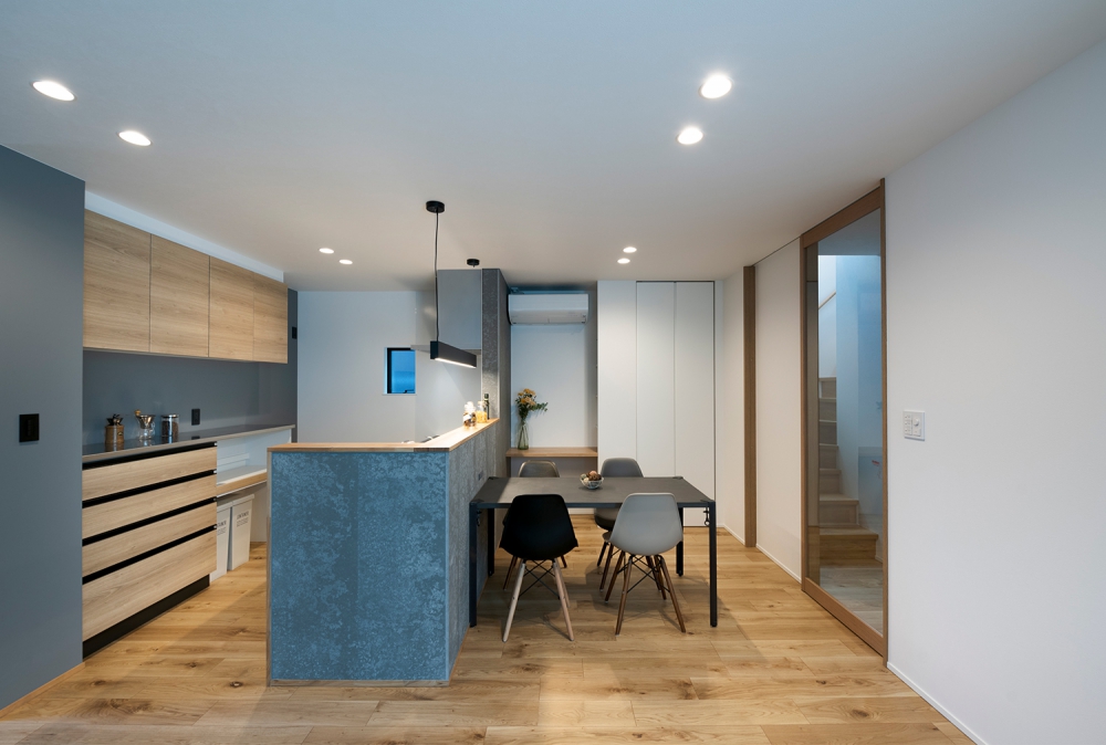 その中で塗壁・セメント板・木板の素材感でアクセント。