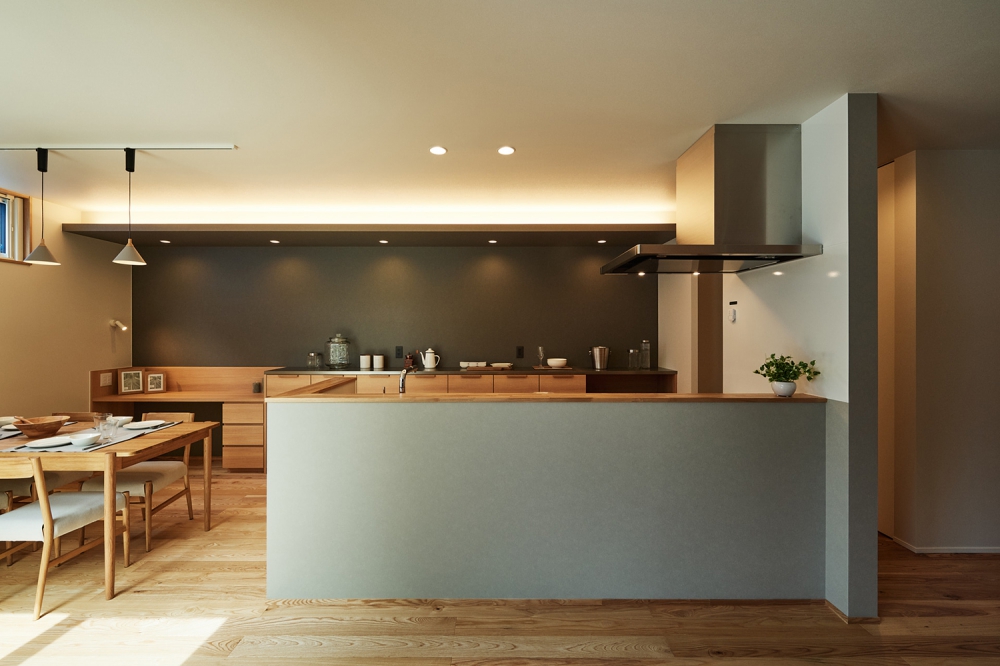 ゆったりとしたキッチンスペース。上下に設置した間接照明が上品な空間を演出している