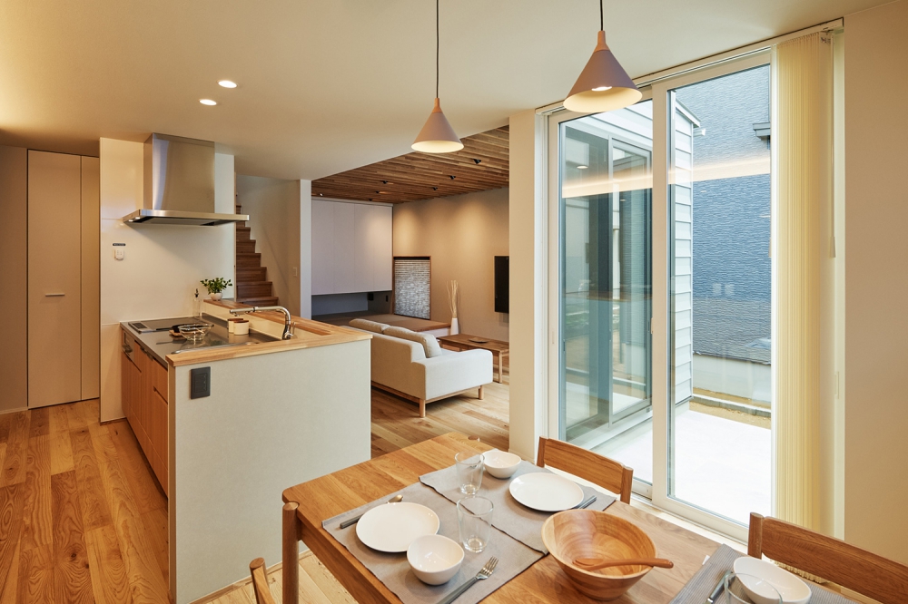 通り沿いには外からの視線に配慮して窓を最小限に抑えてどこか閉鎖された印象を与えるが、LDKは吹き抜けや大開口からの光に溢れ明るく、無垢材の温かみと相まって居心地の良さに包まれている。