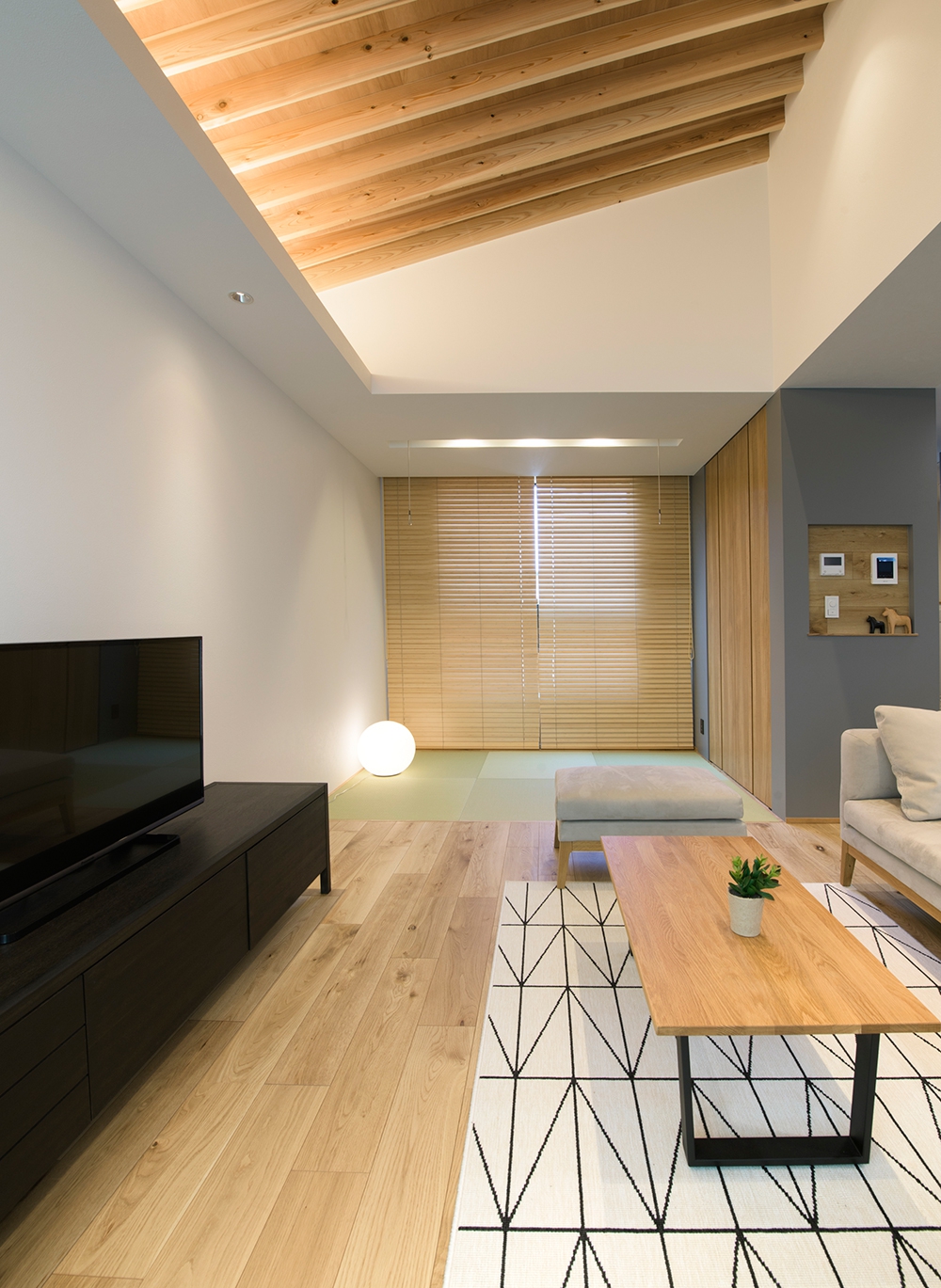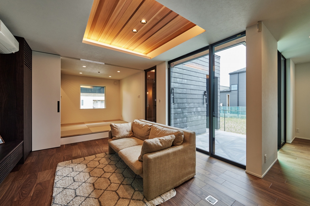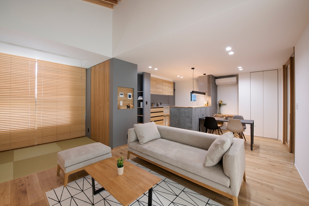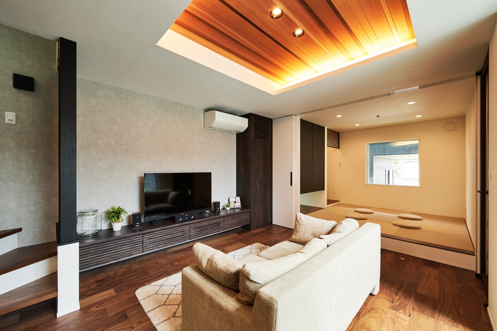 和室と隣接したLDK。シャープな印象と木目のぬくもりが調和した飽きのこない空間デザイン