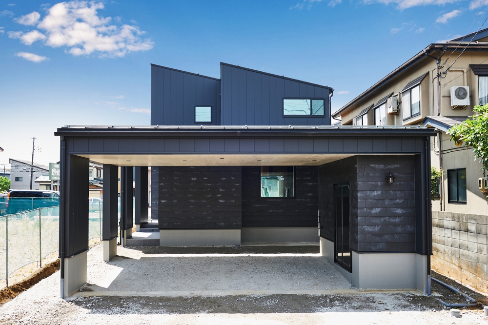 ブラックのガルバリウム鋼板と、SOLIDOを使用したカッコイイ外観。オープンガレージは2台分の車を収容可能