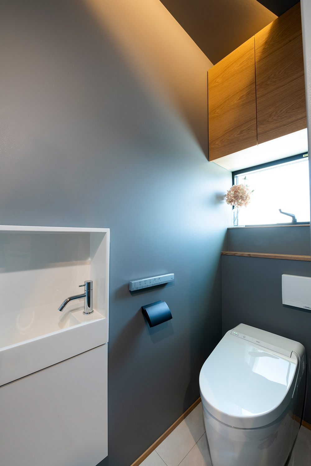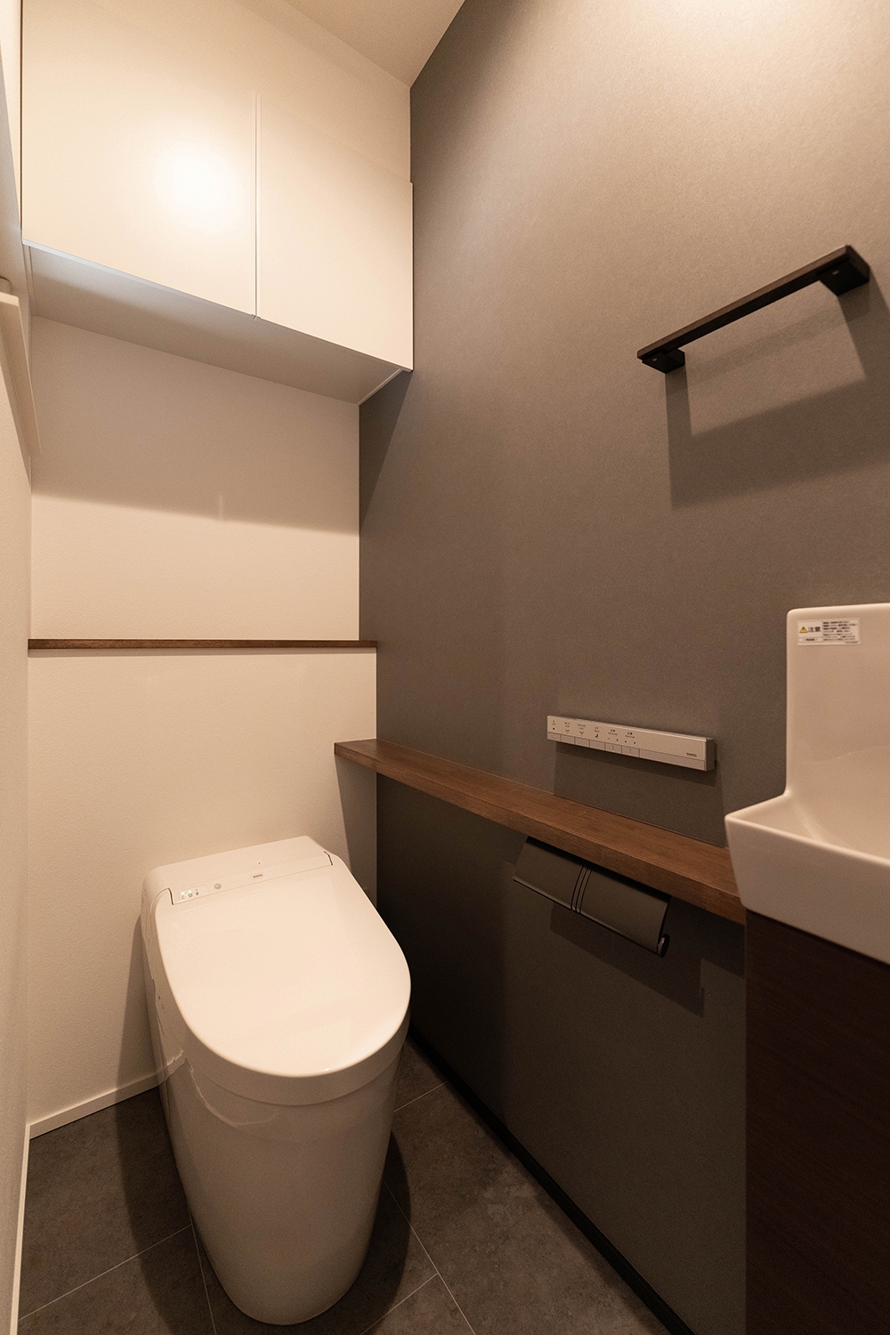 1階トイレはエコカラットを貼り消臭調湿効果。グレーと木目の組み合わせで落ち着いた空間に