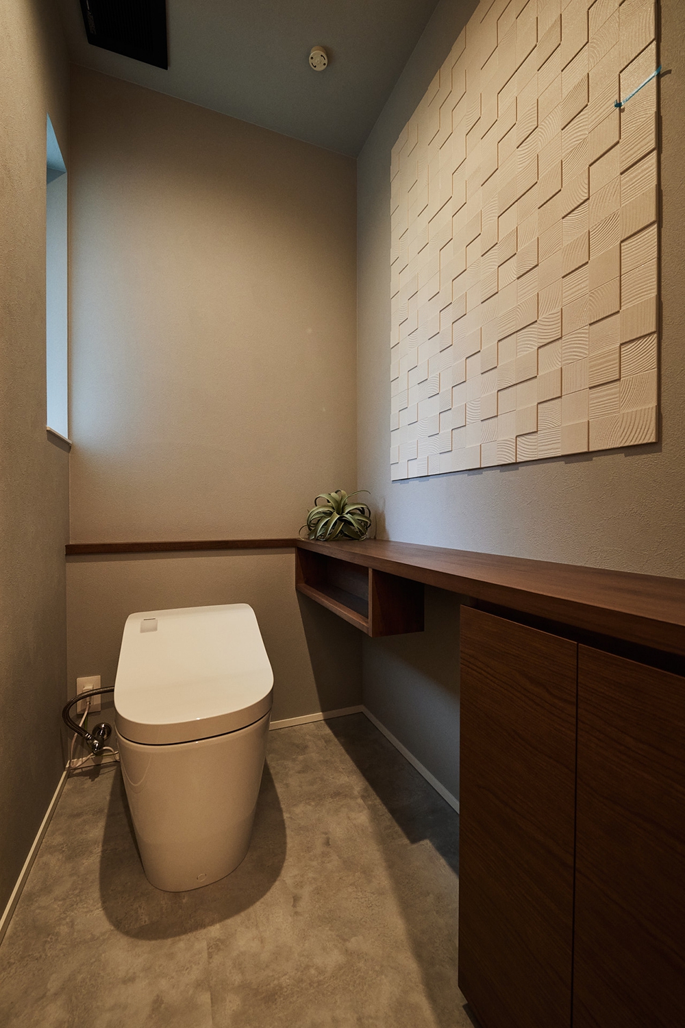 セメント板をアクセントにしたトイレ空間。間接照明が壁面の質感を際立たせ、落ち着いた雰囲気を演出