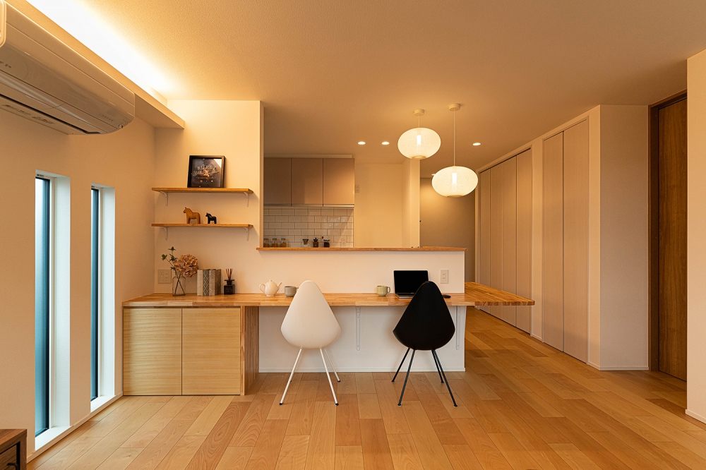落ち着いた雰囲気の中で集中できるよう設計された書斎スペース。壁に沿った造作カウンターは、広々としており、パソコン作業や読書、勉強など多目的に利用できる