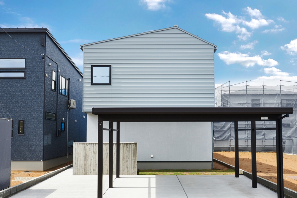 ガルバリウム鋼板とクライマテリアの素材違いを同色のグレーで統一した。サッシとカーポートのブラックが差し色に