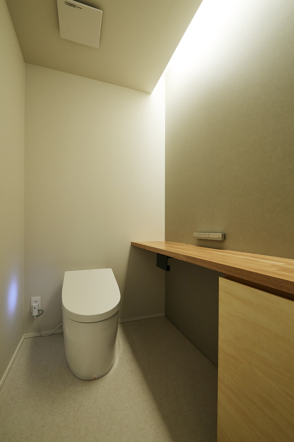 間接照明やカウンター収納を組み合わせた広々とした1階トイレ