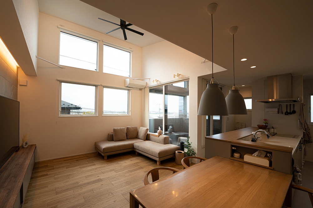 約30帖のLDKに吹抜けを設けることで、より開放的な空間に仕上げ、無垢床にすることで温かみを与えている。