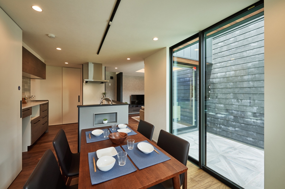 中庭のタイルテラスを眺めるこだわり住宅