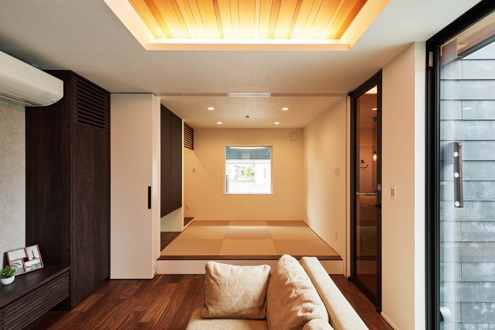 扉を開け放つとLDKと繋げて広く使え、扉を閉めれば個室として来客を泊めることもできる和室。家の雰囲気に合うよう、柔らかな色の畳を採用しオシャレに。収納もたっぷりで便利