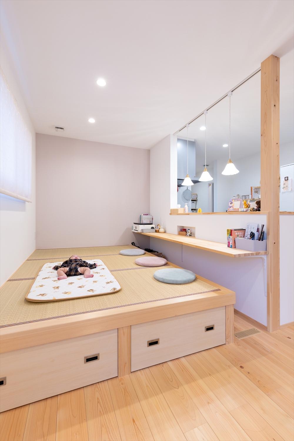 腰掛けとして使える小上がりの和室を設けました。客間やお子さまの遊び場として活躍しています。下部収納にはおむつをしまい、おむつ替えにも活用。カウンターは将来お子さまの勉強机になる予定です。