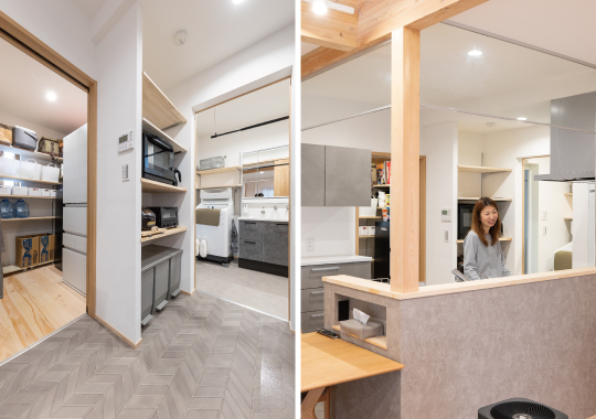 キッチン横には奥様の書斎コーナーを設け、PC作業ができるようにカウンターや照明、コンセントを計画。収納扉付きなので、使わない時や来客時にはスッキリ見せられます。キッチン奥には、リビングから見えにくい位置にパントリーを配置。勝手口から外に出られるため、ごみ出しも楽に行えます。