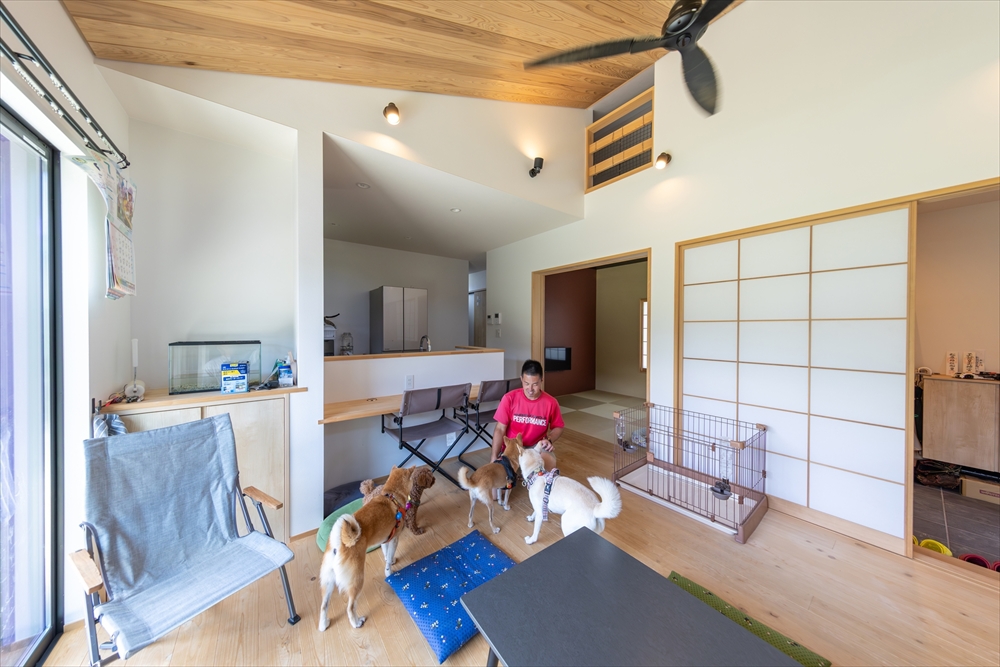 ご夫婦がワンちゃん、猫ちゃんと暮らす平屋です。ひのきの床は肌ざわりがよく、ワンちゃんたちも床にそのまま寝転ぶことが多いとのこと。和室とつながるLDKは、あえて収納を必要な分だけに抑え、ゆったりくつろげる空間を確保しました。