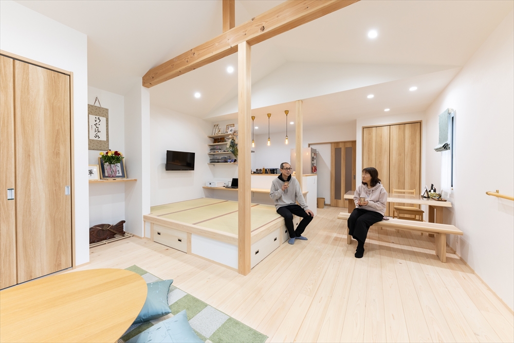 奥様がお子様のオムツ替えをしたり、ご主人がくつろいだり、お父様が腰を掛けたり、時には子どもたちが歌って踊るステージに。間取りの中央にある小上がり畳コーナーは家族みんなのお気に入りです。